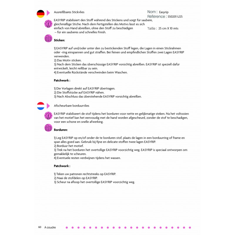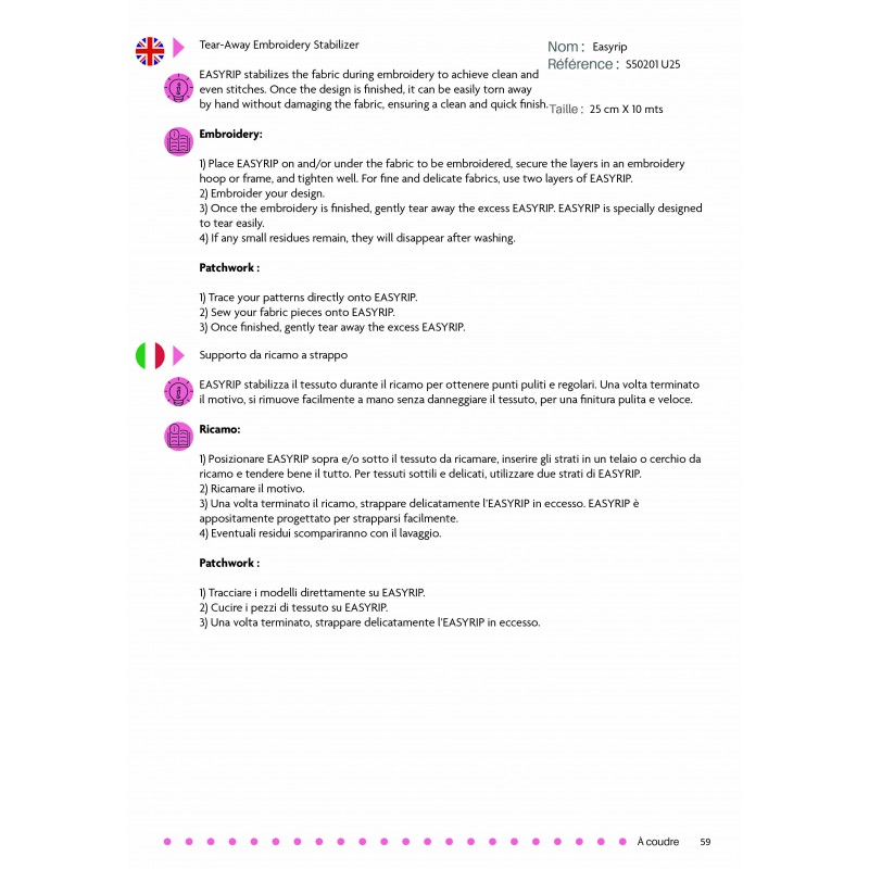 EASYRIP permet de stabiliser le tissu pendant la broderie pour obtenir des points nets et réguliers. Une fois le motif terminé, il se retire simplement à la main, sans abîmer le tissu, pour une finition propre et rapide.