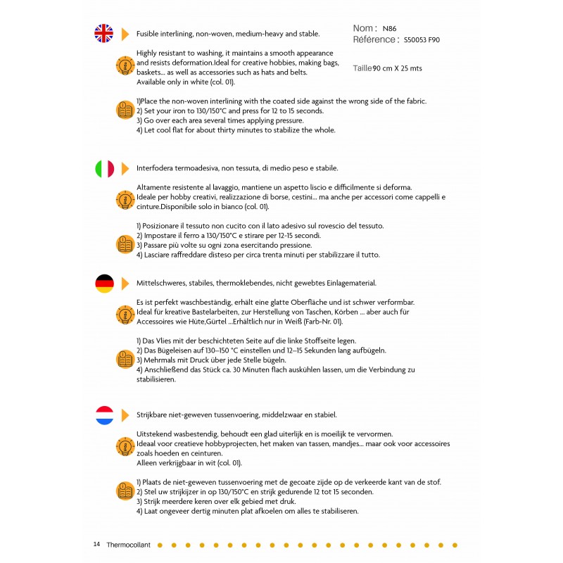 Tessuto non tessuto termoadesivo, medio-pesante e stabile. Ideale per stabilizzare tutti i tipi di accessori e creazioni come cinture, borse, pochette, cappelli… in tessuti leggeri a pesanti.